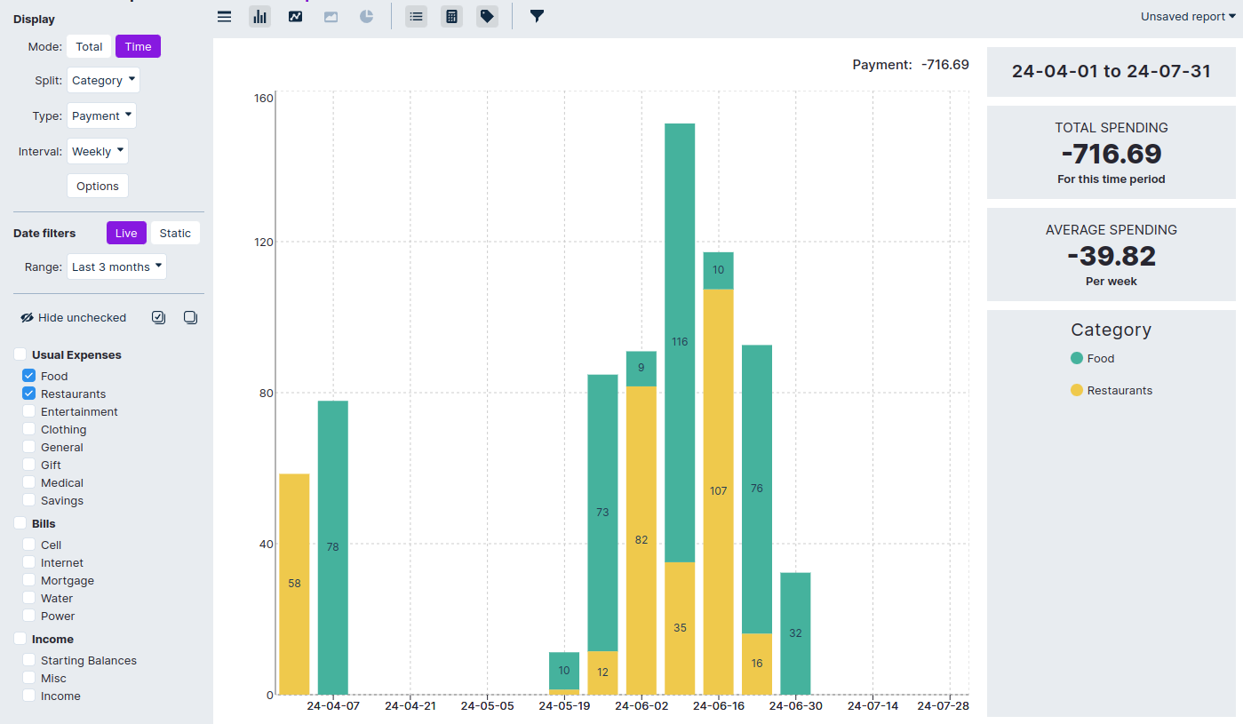 This report is viewing how much was spent on food, by week, in both the Food and Restaurant categories over the last few months.