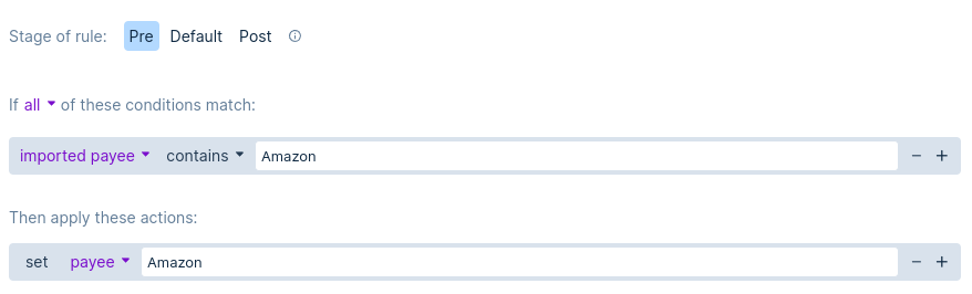 A: Sometimes the payee shows up slightly differently from transaction to transaction. To set the same payee every time and not create a new one every time a new transaction is imported, use a Pre rule that reads the imported payee field and finds the merchant name using a "contains" condition.