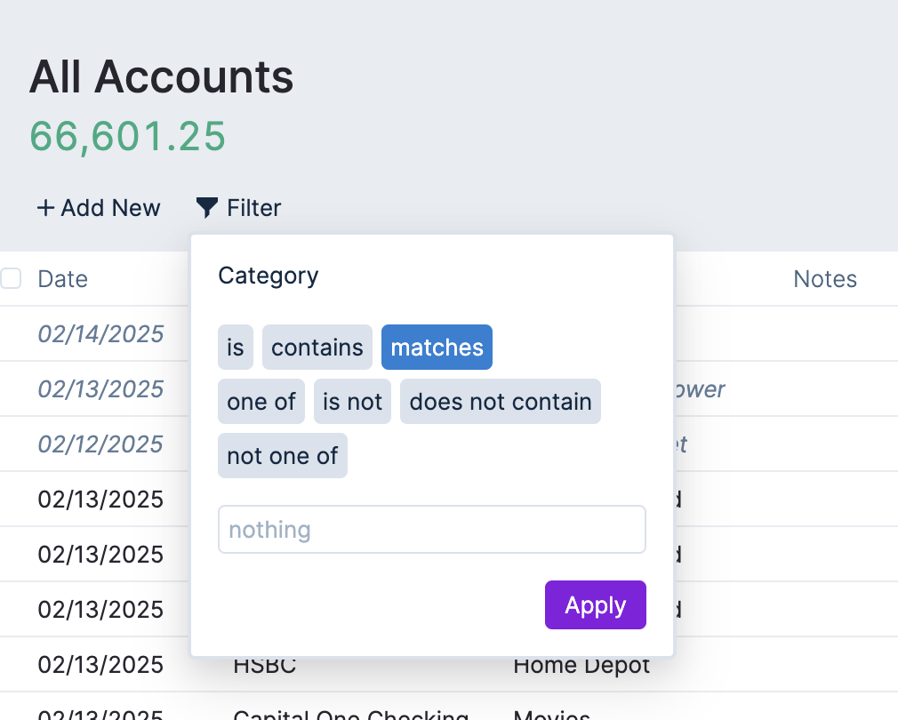 When you want to re-visit a previously saved filter, go to the relevant account page, click on Filter, and select Saved in the dropdown.