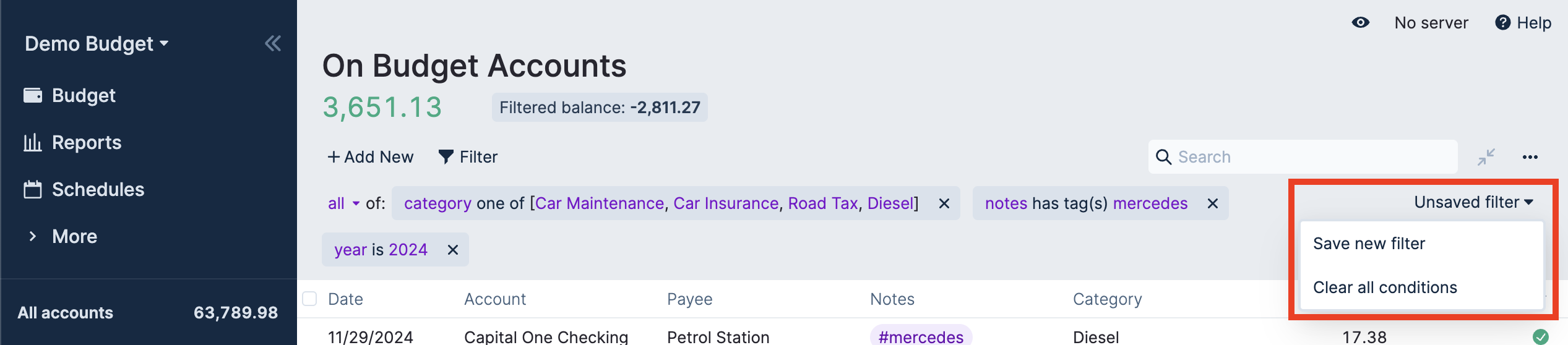 To save a search, simply click on the Unsaved filter dropdown button above the transactions table and click Save new filter.